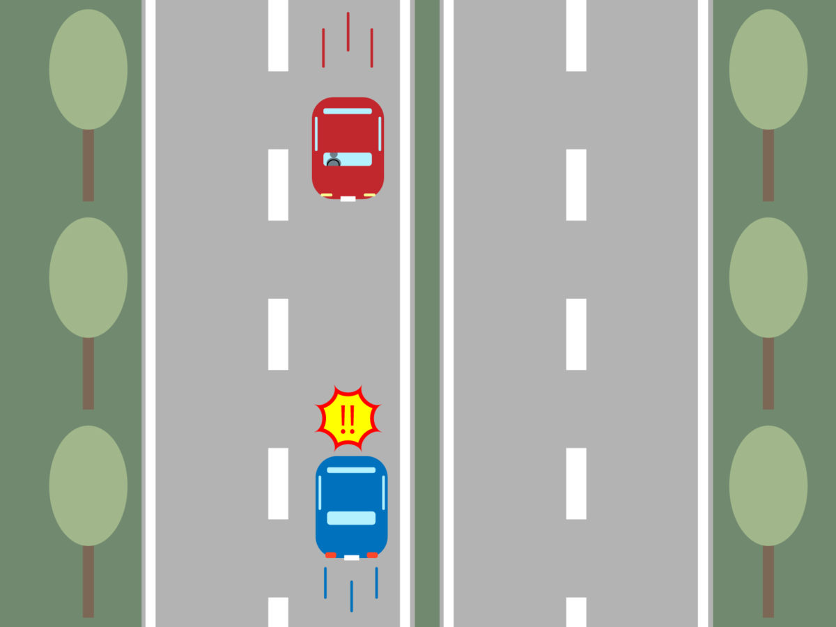 その時は、上記のイラストの状況で走行車線を走り、前の車との距離も十分にあり、夜だったため、遠くからヘッドライトが見えました。